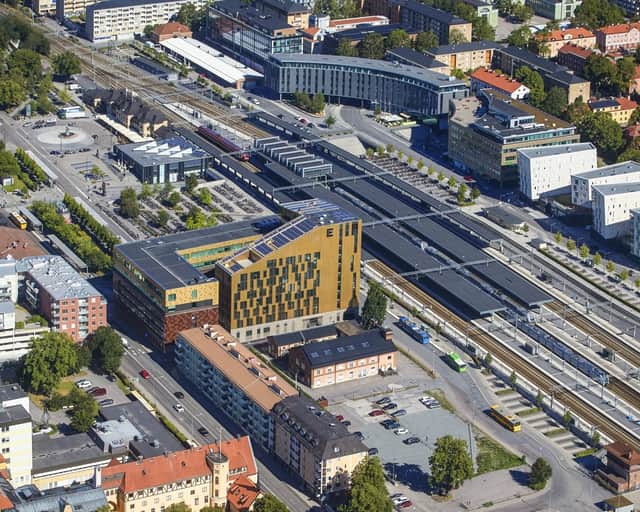 Fastigheten ligger i direkt anslutning till Uppsala Centralstation med avgångar för buss och tåg precis utanför dörren.