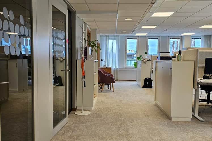 Här i Norrköping gick flytten till mindre och mer effektiva lokaler. Att inte ha onödigt stora ytor som ska värmas upp och möbleras är en fråga om hållbarhet, menar Jessica Winnberg. Och hållbarhet har varit centralt, under hela flytten. Under renoveringsarbetet har både Tyréns och vi på Castellum försökt återbruka så mycket som möjligt. Vi har inte flyttat på väggar i onödan utan i möjligaste mån låtit väggar behålla sitt läge. Vi har återbrukat vägg- och glaspartier, befintliga toaletter och förstärkt fönster med isolerglas i stället för att byta.
