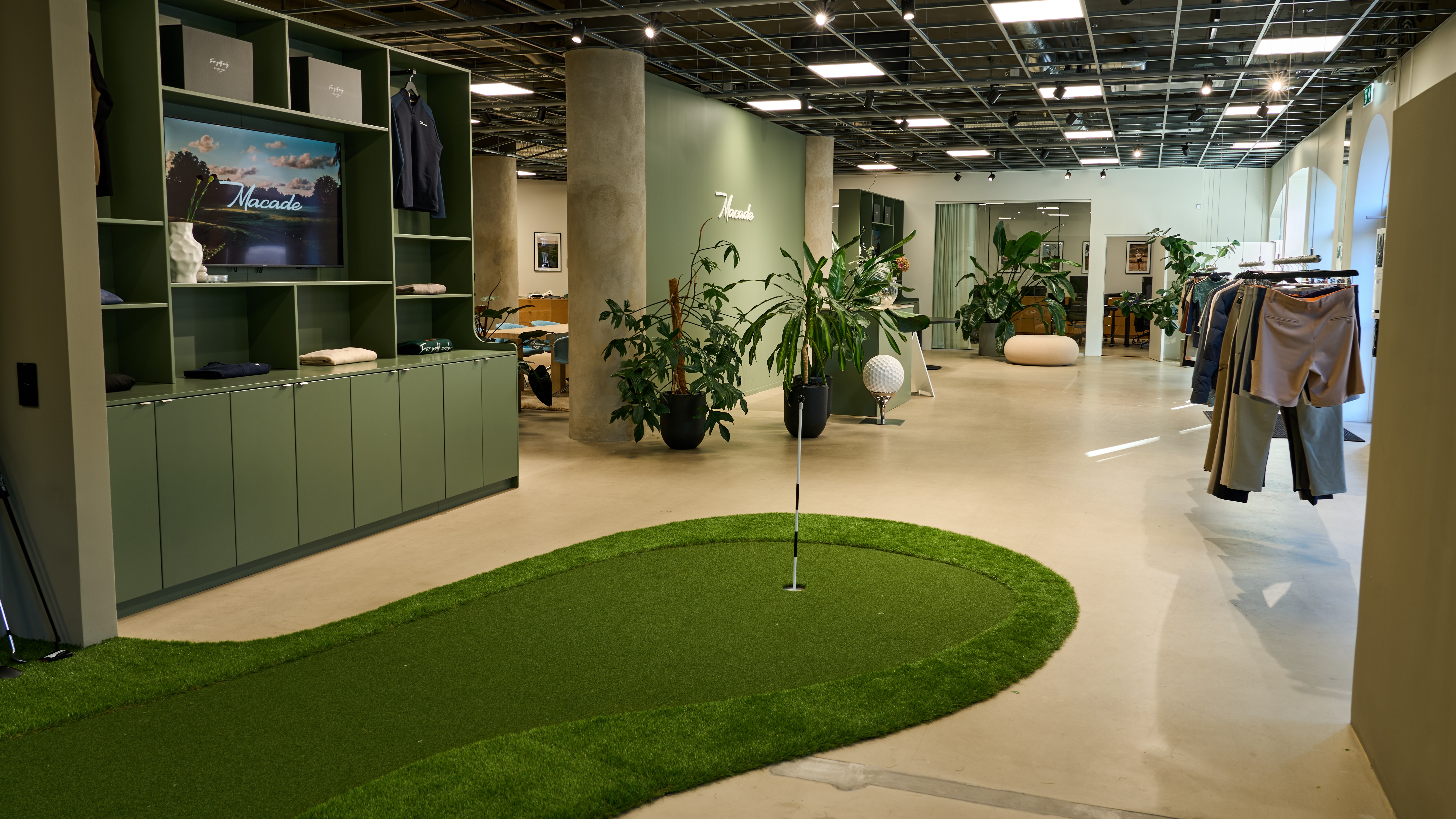 Lokalen är anpassad till Macades behov och långt ifrån en traditionell butiksyta. Här finns en fullskalig golfsimulator, en golfboll stor som en pumpa och en inredning som speglar varumärkets moderna, sportiga estetik. Det är en plats där besökare kan uppleva Macade på riktigt – prova kläder, testa svingen och hämta inspiration.