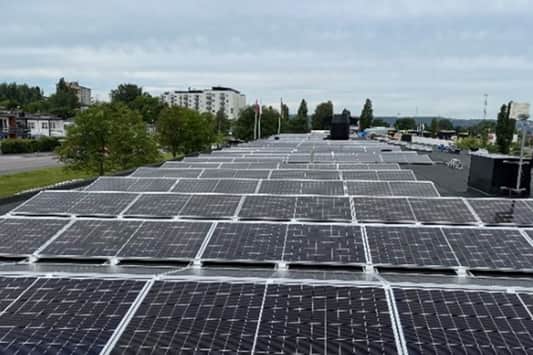 Nu är solpanelerna färdiginstallerade här på fastigheten Visionen på A6-området i Jönköping, redo att genera lokalproducerad el till hyresgäster som Axfood Dagab, Atea och Infokomp.