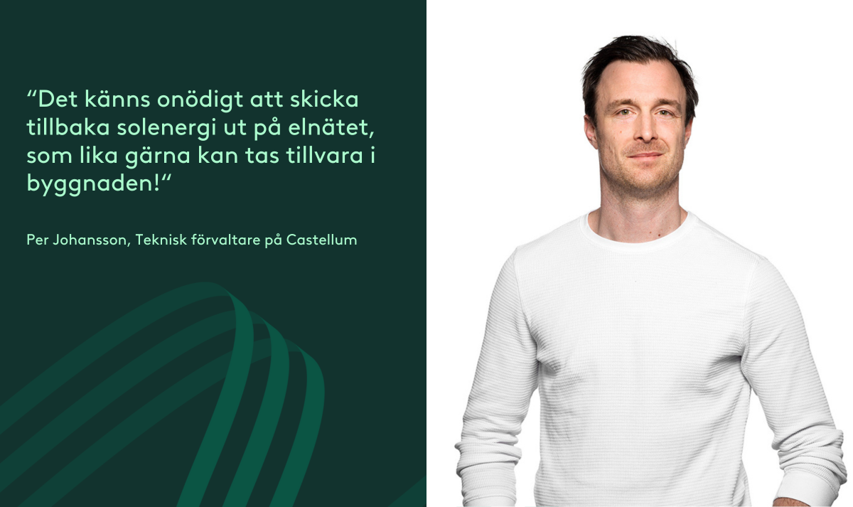 – Producerar vi 100 kWh så nyttjar fastigheten kanske bara 50 kWh. Det känns onödigt och tråkigt att skicka tillbaka solenergi ut på elnätet, energi som lika gärna kan tas tillvara i byggnaden, förklarar Per Johansson, teknisk förvaltare på Castellum.