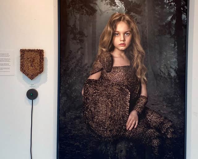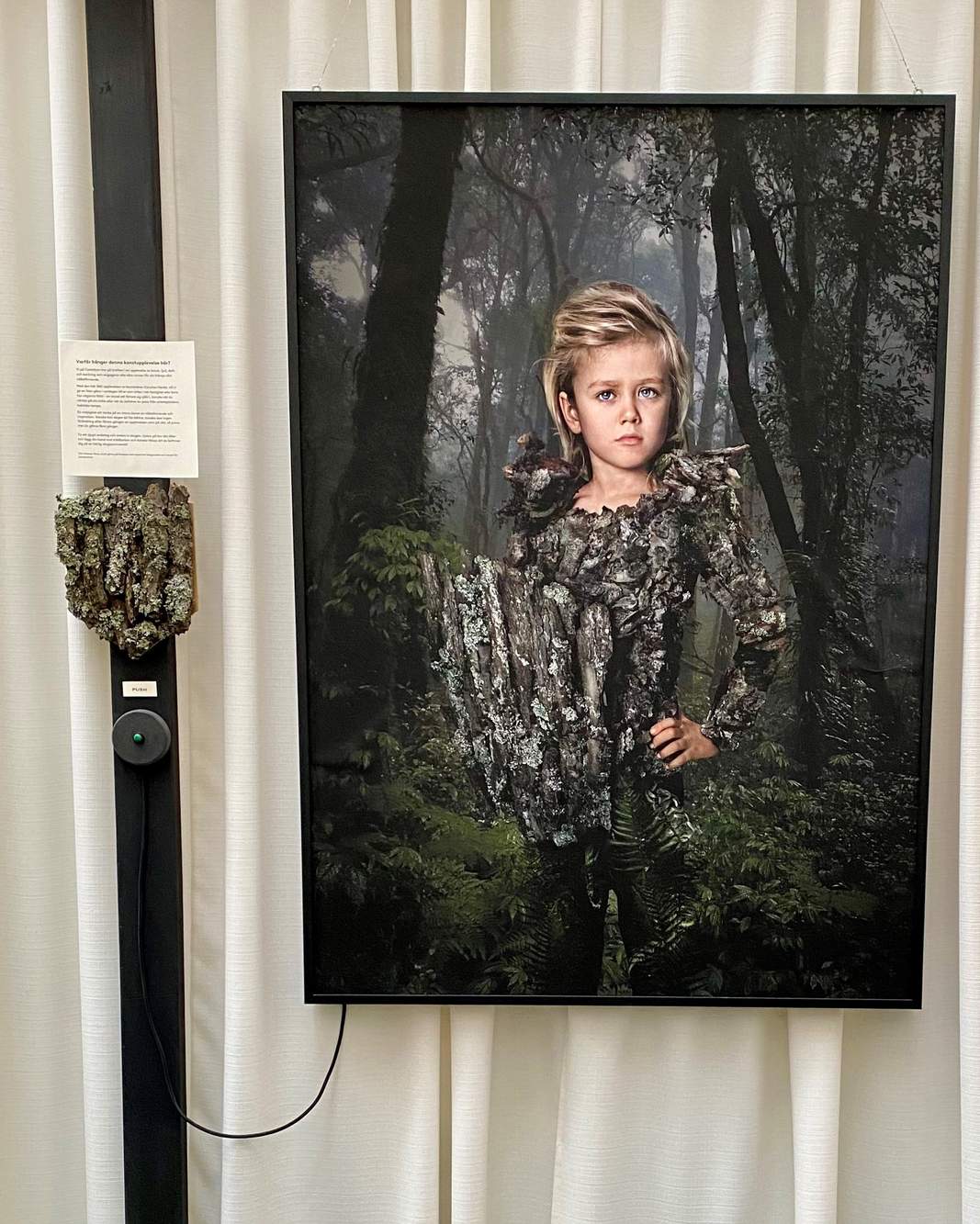 Vid sidan av fotografiet som föreställer ett barn i en drömsk skogsmiljö, hänger en liten kotte-tavla att känna på. Samtidigt flödar ljuden och doften av skog och natur så att du helt kan förflytta dig till sagoskogen, om så bara för en liten stund.