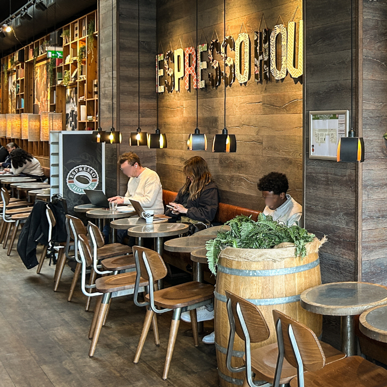 Lokalen präglas av både höjd och djup, med långa bänkar längs väggen under ett nästan katedralmässigt glastak. Här samlas både folk på språng till jobbet och stammisar som tillbringar betydligt längre tid. På morgonen är publiken lite äldre, och många gäster använder gärna det trivsamma kaféer som kontor eller studieplats.