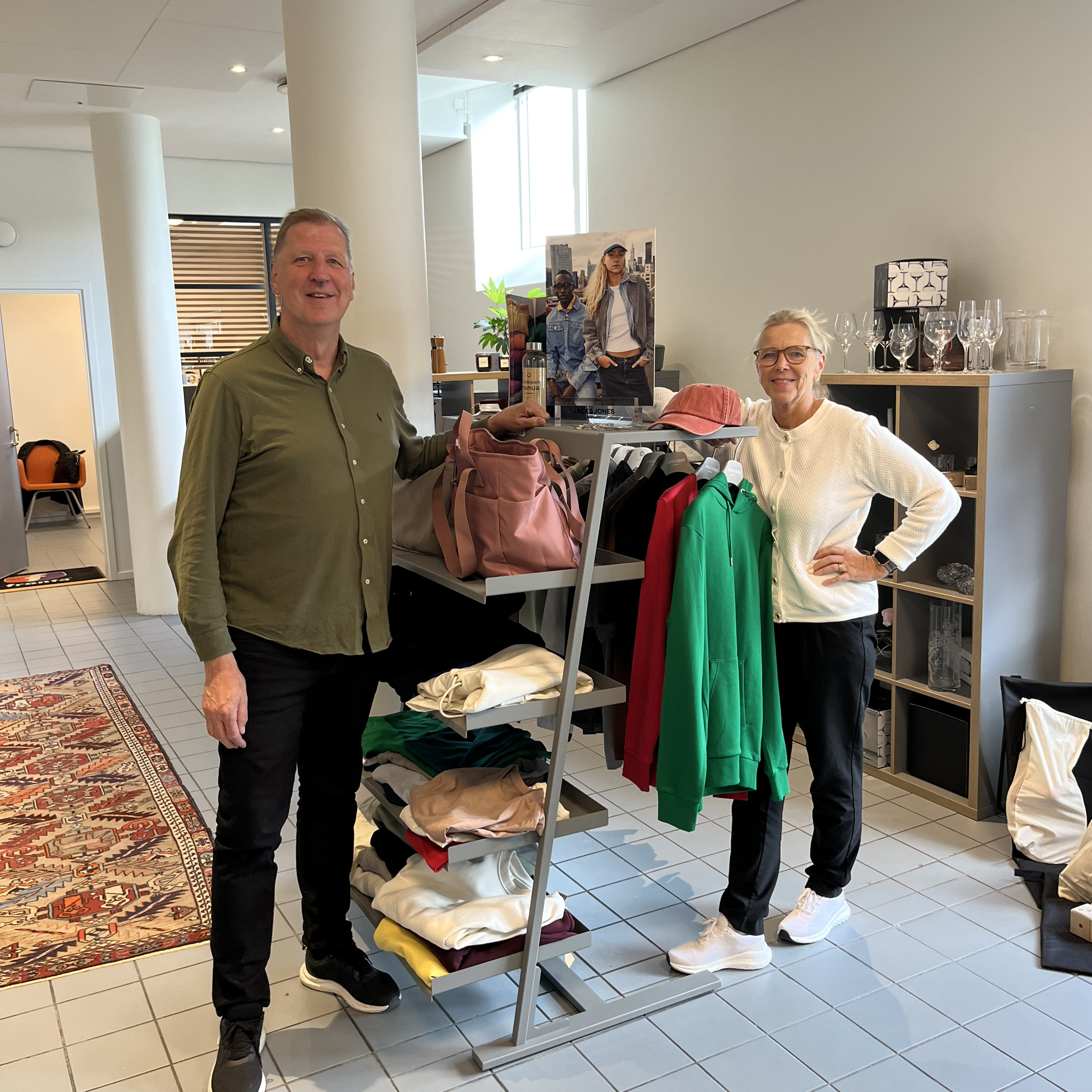 I drygt tjugo år har THK Produkter hjälpt bolag och organisationer att synas med sina varumärken i fokus. Här står ägaren Thomas Hellqvist och marknadsansvariga Helena Hernelind i de nya lokalerna hos Castellum i Borås.