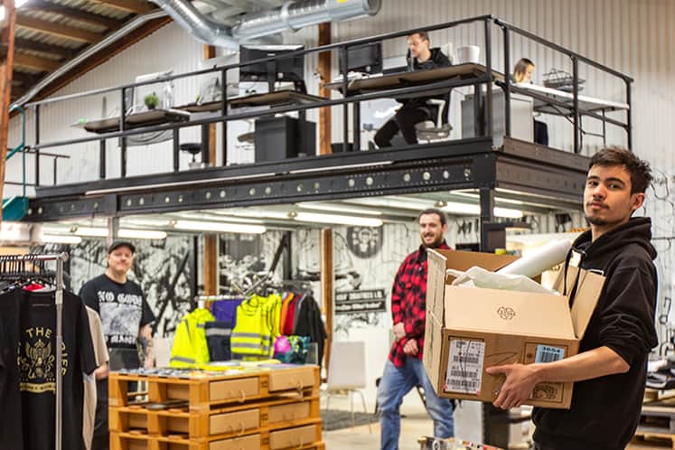 – Man får plats med mycket på 1 000 kvadrat öppen planlösning! Vi har ett eget showroom, en inglasad entresolvåning med svartmålade fönster och en designavdelning 2,5 meter upp. På en av väggarna sitter en 25 meter stor väggdekal med egna varumärken, en handritad Godzilla, motorcyklar och en massa grejer som slåss, vi har ett gym, en fotostudio och ett helt svart kök.