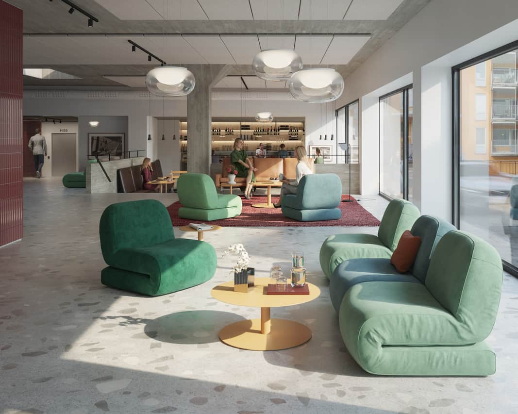 Den gemensamma lobbyn är Erskine & friends hjärta. Det är den som skapar puls från morgon till kväll, och som knyter ihop husen med varandra och gatan med parkutgången. Receptionen och loungen är en naturlig mötesplats för både vänner i huset och besökare, och samtidigt navet till allt det andra som gör det här huset till vad det är. För en arbetsplats är så mycket mer än kontoret, den är ett helt arbetsliv.