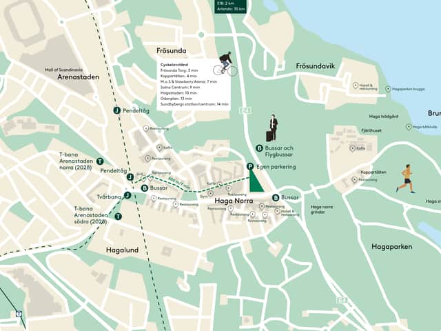 - <10 min till tåg, pendeltåg, buss, flygbuss, t-bana (Arenastaden, 2028)