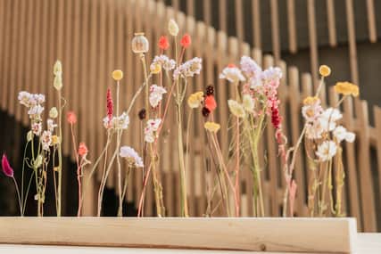 Gardinerna i mötesrummen är återbrukade textiler och kuddarna som du ser runt om på Werket är återbrukdade ryamattor. All lös inredning är inhandlat på second hand. Möblerna på Mötesarenan är omklädda i nya tyger. Här och där runt i husets gemensamma ytor hittar du även vaser gjorda av granbarkborreskadat trä och torkade blommor.