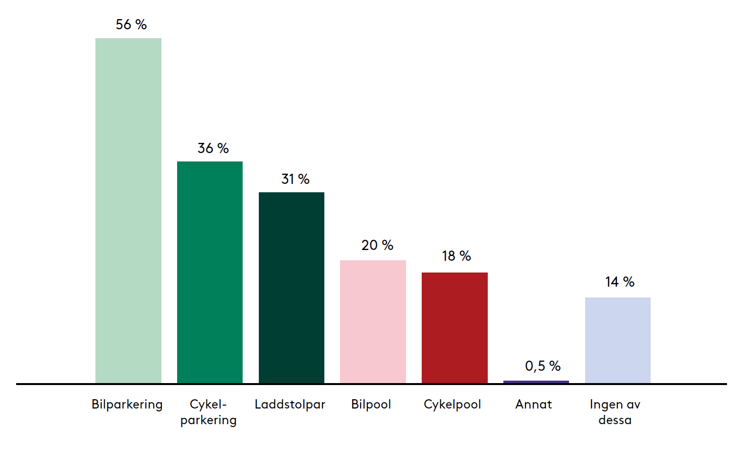Den pågående omställningen kring av hur vi förflyttar oss återspeglas även i årets undersökning. Transportrelaterade egenskaper som parkering för både bil och cykel, laddstolpar, bilpool och cykelpool har blivit viktigare för att ett kontor ska uppfattas som attraktivt. Tillgång till bilparkering är fortfarande nummer ett på önskelistan, och har ökat från 49 till 56 procent. Ju större företag, desto viktigare blir parkeringen och det är ingen större skillnad varken mellan olika åldersgrupper eller mellan storstäder och mindre orter. Många vill alltså fortfarande köra bil till kontoret, men de största rörelserna kring kontorets tillgänglighet handlar om hållbara transporter med cykel eller elbil alternativt genom bil- eller cykelpool. Efterfrågan på laddstolpar för elbil ökar med 41 procent i årets mätning. Önskan om cykelparkering går upp med 44 procent.