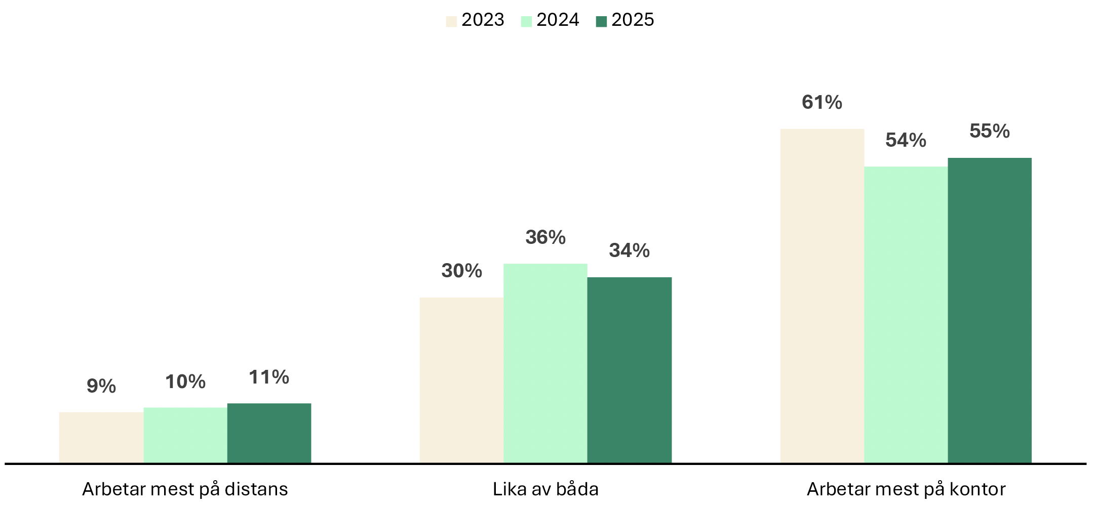| År | Huvudsakligen på distans | Lika mycket på kontor som på distans | Huvudsakligen på kontoret |