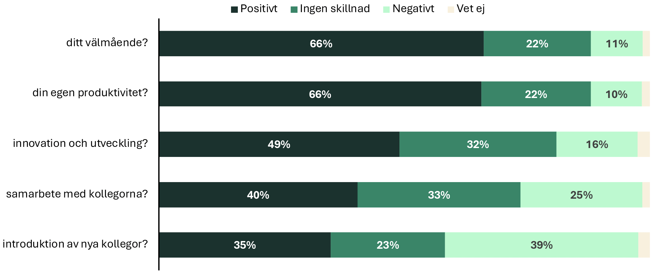 En majoritet (66 %) anser att distansarbete gynnar både välmående och den egna produktiviteten, vilket är en ökning med ungefär 16 procent för välmåendet och 18 procent för produktiviteten jämfört med föregående år. Enbart 16 procent tycker att innovation och utveckling påverkas negativt av distansarbete och bara var fjärde tycker distansarbete försvårar samarbete med kollegorna. Däremot är det fler som upplever utmaningar när det gäller introduktion av nya kollegor. 39 procent anger att distansarbete påverkar introduktionen av nya kollegor negativt jämfört med 21 procent föregående år.