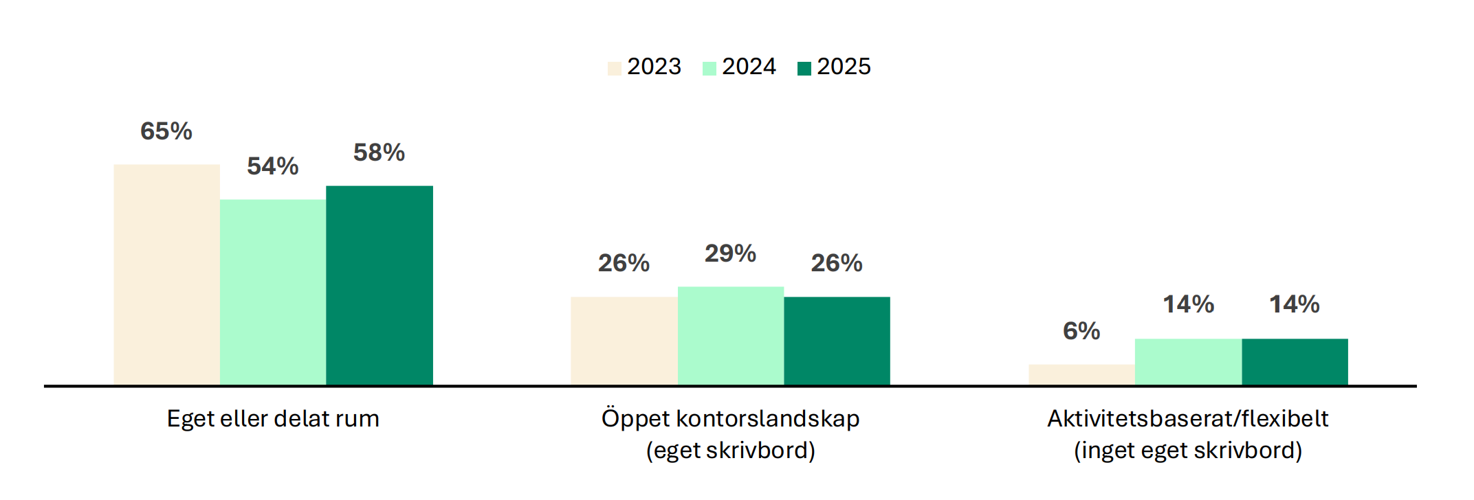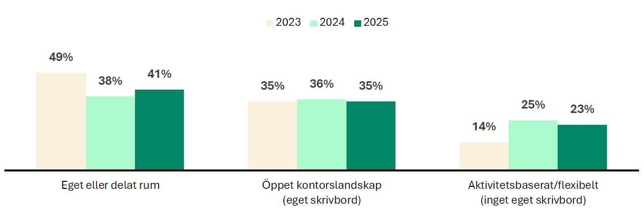 Majoriteten arbetar idag i öppet kontorslandskap, varav en dryg tredjedel har eget skrivbord och en dryg femtedel sitter i ett aktivitetsbaserat kontor med flexibel placering. Särskilt vanligt är det öppna landskapet på stora företag. Får kontorsarbetarna själva bestämma är det däremot eget eller delat rum som gäller. 58 procent anger att de föredrar att sitta i ett eget eller delat rum, jämfört med 41 procent som faktiskt gör det idag. Att sitta i eget eller delat rum är vanligast på mindre företag utanför storstäderna. Det är också en generationsfråga där äldre föredrar det egna rummet medan yngre är mer positiva till öppna ytor. Men även yngre vill ha eget rum i lite högre grad än de faktiskt har idag. Undersökningen visar att de som har ett avskilt rum generellt är mer nöjda med sitt kontor och spenderar mer tid där jämfört med de som sitter i öppet landskap eller på aktivitetsbaserade kontor. Samtidigt är de som redan arbetar på ett aktivitetsbaserat kontor mer positiva till denna kontorslösning än de som inte gör det. Många är också positiva till coworking där man delar kontor, mötesrum och service med andra företag. Nästan 70 procent av de tillfrågade kan tänka sig att arbeta helt eller delvis på ett coworkingkontor. Unga kontorsarbetare och de som arbetar på små företag är mest positiva.