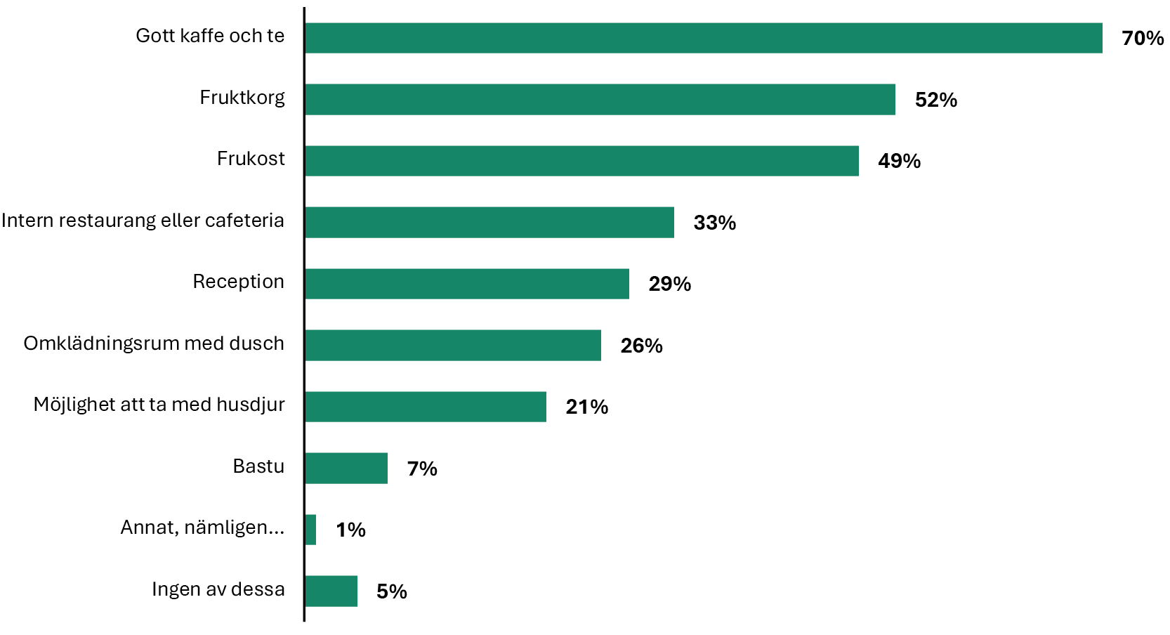 Gott kaffe och te har i många år toppat listan över vilken service svenska kontorsarbetare uppskattar mest på kontoret. 2025 är inget undantag. Nära 7 av 10 värderar en god kopp kaffe eller te högt. Fruktkorgar och frukost bidrar också till att göra kontoret mer attraktivt enligt varannan kontorsarbetare. Ungefär var tredje kontorsarbetare uppskattar service som reception och intern restaurang eller café i huset. Och var fjärde ser gärna att det finns omklädningsrum och dusch på kontoret. Var tionde man hade dessutom uppskattat en bastu på arbetsplatsen, medan bara var tjugonde kvinna hade uppskattat bastun. Kvinnor värderar däremot möjligheten att ta med husdjur till kontoret i högre grad än män, 27 procent jämfört med 15 procent.