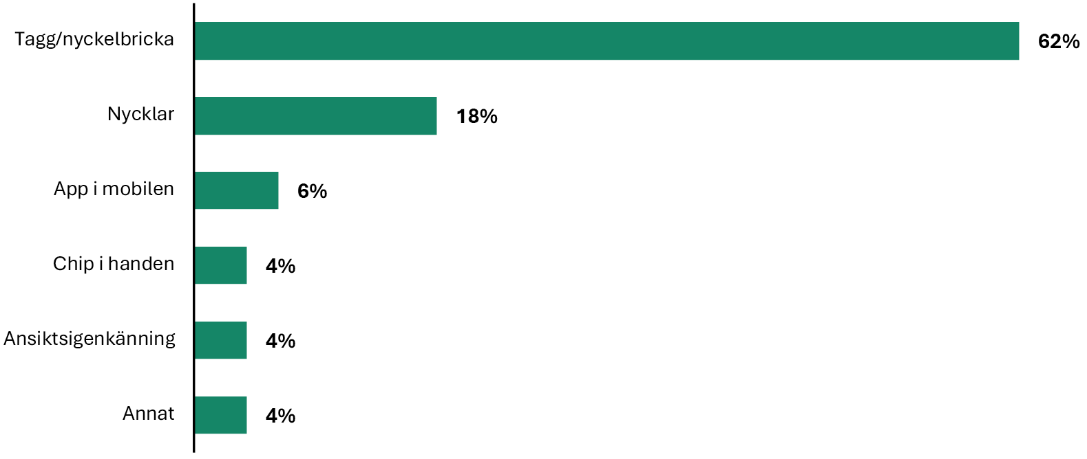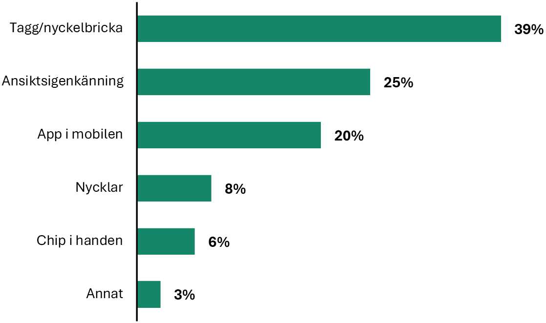 Majoriteten av kontorsarbetarna arbetar på en arbetsplats där man öppnar dörrarna med tagg eller nyckelbricka. Näst vanligast är att använda en vanlig nyckel. Mer teknikorienterade alternativ, som att använda en app, ansiktsigenkänning, eller ha ett chip inopererat i handen, används till lägre grad. På mindre företag är det vanligast att man använder en vanlig nyckel, särskilt på företag med färre än nio anställda. När vi istället frågar hur man vill öppna dörrarna till kontoret om tio år blir resultaten annorlunda. Många vill fortfarande använda tagg eller nyckelbricka, men de är inte längre i majoritet. Man vill även använda nycklar i lägre grad framöver. Medan var fjärde hoppas på att kunna öppna dörrarna med ansiktsigenkänning, jämfört med 4 procent som uppger att de redan gör det idag. Det är också fler som vill öppna dörrarna med en app i mobilen.